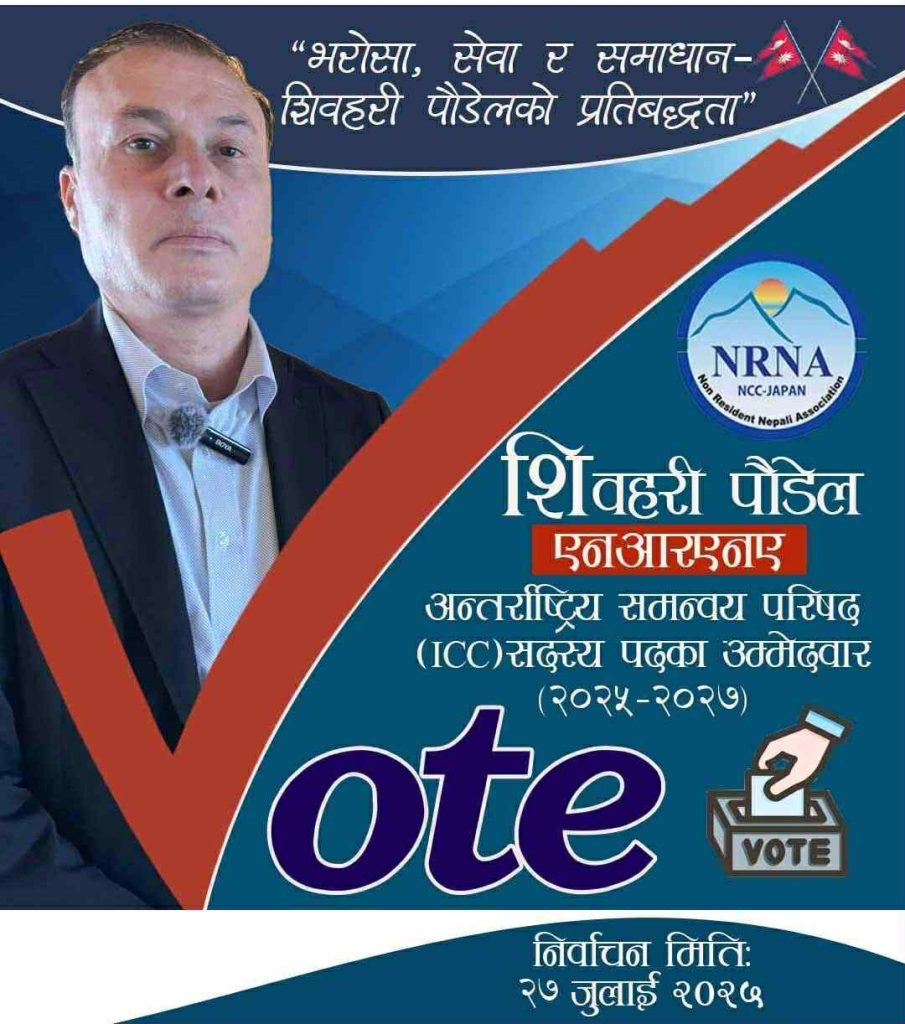 झन्डै तिन दशक अवधी देखि जापानको टोकियोमा बसोबास गर्दै आएका शिवहरी पौडेलले गैरआवासीय नेपाली संघ (एनआरएनए) जापानको २०२५–२०२७ कार्यकालको निर्वाचन प्रणाली बाट छानिने अन्तर्राष्ट्रिय समन्वय परिषद (ICC) सदस्य पदमा उम्मेदवारी घोषणा गरेका छन् । जापानमार्फत आइसीसीमा प्रतिनिधित्व गर्ने सदस्य संख्या आठजना रहेको छ यही निर्वाचनबाट यी प्रतिनिधिहरू चयन गरिनेछन्। यी प्रतिनिधिहरू आगामी अक्टोबरमा काठमाडौंमा हुने एनआरएनए अन्तर्राष्ट्रिय निर्वाचन (NCC) मा भाग लिन पाउने प्रतिनिधीहरू हुन् ।